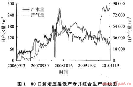 針對煤層氣排采過程中煤層滲透性低、易造成煤粉堵塞的情況,為恢復(fù)儲層滲透性、提高低效井單井產(chǎn)量,開展了低產(chǎn)井大液量、高排量壓裂增產(chǎn)技術(shù)。特別是2008年以來,針對不同的傷害原因,結(jié)合煤巖結(jié)構(gòu)特征,開展了不同規(guī)模的二次重復(fù)壓裂試驗研究,逐步發(fā)展完善形成了自己特有的二次壓裂解堵性壓裂增產(chǎn)技術(shù)。該技術(shù)可有效清除近井地帶的煤粉沉積、改善因應(yīng)力變化而發(fā)生變形或者閉合的微孔隙,重新建立起與遠端溝通的通道;同時還可有效地解除氣鎖和膠結(jié)的煤粉的影響,防止煤層的進一步垮塌。2009年底至2010年規(guī)模實施二次壓裂解堵井80口(圖1),平均單井日增產(chǎn)1000m3左右。目前煤層氣解堵性壓裂工藝技術(shù)已經(jīng)從局部實驗階段走向全面現(xiàn)場應(yīng)用階段,具有較強的適應(yīng)性和針對性,取得了較好的增產(chǎn)效果和可觀的經(jīng)濟效益。