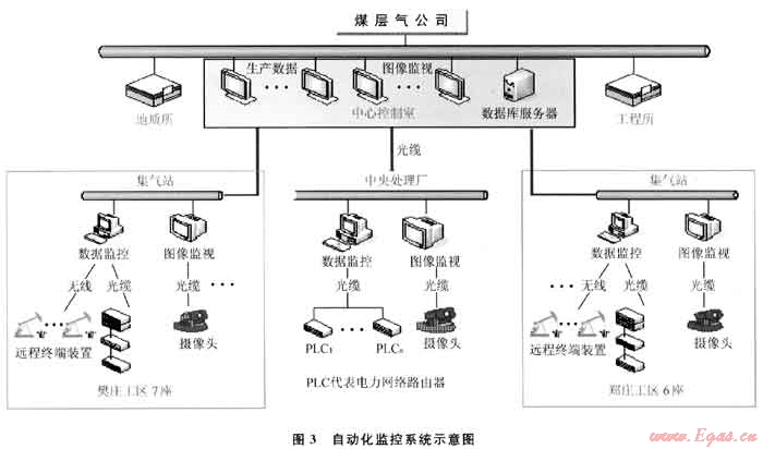 采用SCADA系統(tǒng)對全區(qū)生產(chǎn)運行分單井-集氣站-處理中心3級監(jiān)控和運營管理(圖3),集氣站采用以計算機控制技術(shù)為核心的站控系統(tǒng)(SCS),完成站場內(nèi)工藝過程的數(shù)據(jù)采集和監(jiān)控任務(wù),采氣井場設(shè)置SCADA系統(tǒng)遠程終端裝置(RTU),將井口數(shù)據(jù)通過無線寬帶+光纜傳輸?shù)姆绞絺髦翑?shù)據(jù)中心。實現(xiàn)了生產(chǎn)管理的智能化,減少了30%的用工總量,保障了系統(tǒng)平穩(wěn)運行,提高了管理水平和工作效率。