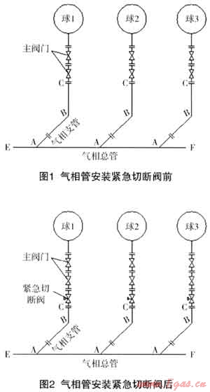 氣相管安裝前如圖1所示:將氣相支管從法蘭連接處A、C點(diǎn)斷開后移出罐區(qū)外,切割短管BC,使其尺寸適合與緊急切斷閥連接,并且在C點(diǎn)加焊法蘭盤。氣相管安裝后如圖2所示:在球罐根部2個(gè)氣相主閥門下安裝緊急切斷閥,將加工后的氣相支管ABC分別與氣相總管EF及緊急切斷閥連接,完成安裝工作。