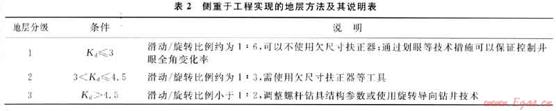 基于上述認(rèn)識,可進(jìn)而提出以工程實現(xiàn)能力為依據(jù)的地層分級方法。即根據(jù)井眼尺寸和地層對于鉆井手段的響應(yīng)效果進(jìn)行分級。例如,在大牛地氣田,根據(jù)地層可鉆性級值,Φ215.9mm井眼可以將地層分為3級(圖3)。地層可鉆性級值(Kd)小于3的可劃分為I級,對應(yīng)的復(fù)合鉆進(jìn)全角變化率小于3.5°/100m,即復(fù)合鉆進(jìn)60m,井斜最大增加2.1°,使用1.25°單彎動力鉆具滑動鉆進(jìn)10m左右即可控制井眼軌跡?;瑒鱼@進(jìn)與旋轉(zhuǎn)鉆進(jìn)的比例接近1:6。實際施工中,當(dāng)所鉆地層Kd<3時,可以使用“鉆頭+單彎螺桿動力鉆具+無磁鉆具+……”的常用鉆具組合,通過多次劃眼、控制鉆壓等方法均可有效降低復(fù)合鉆進(jìn)井段的全角變化率。根據(jù)地層可鉆性級值選擇底部鉆具組合及井眼軌跡控制的方法見表2。