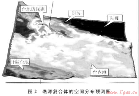 在精細(xì)層位對比解釋的基礎(chǔ)上,基于古地貌恢復(fù)的生物礁灘三維成圖,便可繪制出礁灘復(fù)合體的空間分布圖。圖2為根據(jù)三維地震資料繪制的飛仙關(guān)組沉積前古地貌展布網(wǎng),反映了長興組生物礁的空間展布,早期在臺(tái)地內(nèi)形成了灘相沉積,隨著長興期生物礁快速生長和加積,在臺(tái)地邊緣形成生物礁灘復(fù)合帶。礁灘復(fù)合體空間分布圖確定后,相應(yīng)的沉積相帶也可解釋出來,圖中可明顯地劃分出陸棚、斜坡、臺(tái)地邊緣礁、臺(tái)內(nèi)灘、開闊臺(tái)地等相帶。