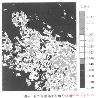 圖4是長興組頂部關(guān)聯(lián)維分析結(jié)果。實(shí)鉆的B102井和8103h井在長興組上部鉆遇礁蓋白云巖儲(chǔ)層,B102井測試獲工業(yè)氣流,不含水,而8103h井出水,且海拔位置比B102井還高,證明這2口井分屬不同的氣藏,儲(chǔ)層預(yù)測及反演結(jié)果難以進(jìn)行區(qū)分,而基于波形復(fù)雜程度的關(guān)聯(lián)維分析表明兩二者之間存在變化且互不連通。因此可以利用反映波形復(fù)雜程度的屬性來刻畫儲(chǔ)層的非均質(zhì)性和復(fù)雜性,但無法區(qū)分礁和灘。