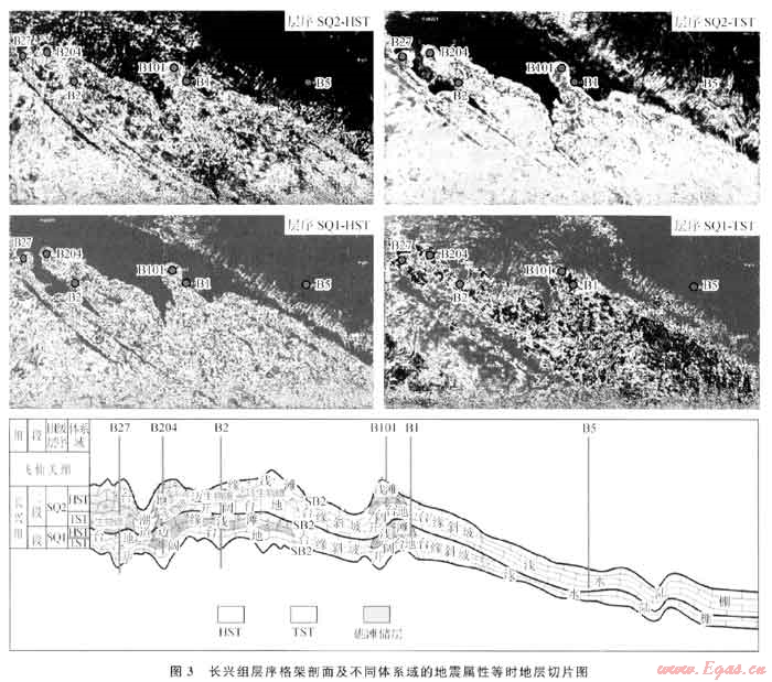 圖3是在長興期層序格架劃分基礎(chǔ)上,對兩個(gè)Ⅲ級(jí)層序中控制儲(chǔ)層發(fā)育的體系域進(jìn)行地震屬性的等時(shí)地層切片,能較好地反映了長興組礁、灘體的發(fā)育和演化規(guī)律。長一段下部為海侵體系域(SQ1-TST),B1井及以西地區(qū)為開闊臺(tái)地相沉積,B1井以東相變?yōu)榕_(tái)地邊緣斜坡陸棚沉積,儲(chǔ)層不發(fā)育。長一段上部為高位體系域(SQ1-HST),B5井西南地區(qū)為臺(tái)地邊緣淺灘相沉積,淺灘相儲(chǔ)層發(fā)育;B1井以東相變?yōu)榕_(tái)地邊緣斜坡陸棚沉積,地層薄,儲(chǔ)層不發(fā)育。長二段下部為海侵體系域(SQ2-TST),B5井以西南地區(qū)為開闊臺(tái)地相沉積,局部地勢較高部位(如B101井)發(fā)育生屑白云巖儲(chǔ)層;B1、B5井以東地區(qū)相變?yōu)榕_(tái)地邊緣斜坡 陸棚沉積,儲(chǔ)層不發(fā)育。長二段上部為高位體系域(SQ2-HST),B5、B1井以西南地區(qū)為臺(tái)地邊緣礁灘沉積,儲(chǔ)層發(fā)育,物性好、厚度大、分布廣;B1、B5井以東地區(qū)相變?yōu)榕_(tái)地邊緣斜坡-陸棚沉積,儲(chǔ)層不發(fā)育。因此,長興組的儲(chǔ)層明顯受到沉積體系域的控制,主要發(fā)育在高位體系域內(nèi)的臺(tái)地邊緣礁灘相中,并且表現(xiàn)為早期以灘相沉積為主,晚期以礁相沉積為主,平面上具有前礁后灘的特點(diǎn)。