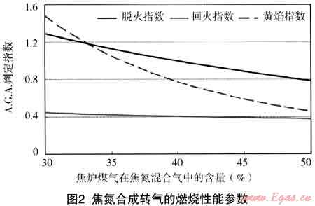 根據(jù)美國燃?xì)鈪f(xié)會(huì)A.G.A.36#公告中公布的關(guān)于燃?xì)饣Q性預(yù)測(cè)的方法[2~4],利用“I”指數(shù)法,對(duì)焦氮混合氣替代高焦合成轉(zhuǎn)氣時(shí)的脫火指數(shù)、回火指數(shù)和黃焰指數(shù)進(jìn)行了計(jì)算,其結(jié)果如圖2所示。