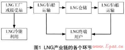 LNG產(chǎn)業(yè)是典型的鏈條產(chǎn)業(yè),從上游的天然氣開(kāi)采與生產(chǎn)、天然氣液化、LNG貿(mào)易運(yùn)輸?shù)絃NG終端利用,形成了完整的產(chǎn)業(yè)鏈。[3]隨著國(guó)內(nèi)經(jīng)濟(jì)的快速發(fā)展,制造業(yè)及社會(huì)消費(fèi)對(duì)石油需求日益增大。國(guó)家一年多次調(diào)整油價(jià),天然氣與石油等熱值價(jià)格比一直在擴(kuò)大。受供求關(guān)系及市場(chǎng)預(yù)期的影響,進(jìn)口和國(guó)產(chǎn)LNG產(chǎn)能將迅速放大,LNG產(chǎn)業(yè)開(kāi)始進(jìn)入快速發(fā)展的進(jìn)程。LNG產(chǎn)業(yè)的發(fā)展同時(shí)帶動(dòng)了物流業(yè)、深冷設(shè)備制造業(yè)、天然氣發(fā)動(dòng)機(jī)制造業(yè)等國(guó)內(nèi)多行業(yè)的發(fā)展。圖1描述了國(guó)內(nèi)LNG產(chǎn)業(yè)鏈的各個(gè)環(huán)節(jié)。
