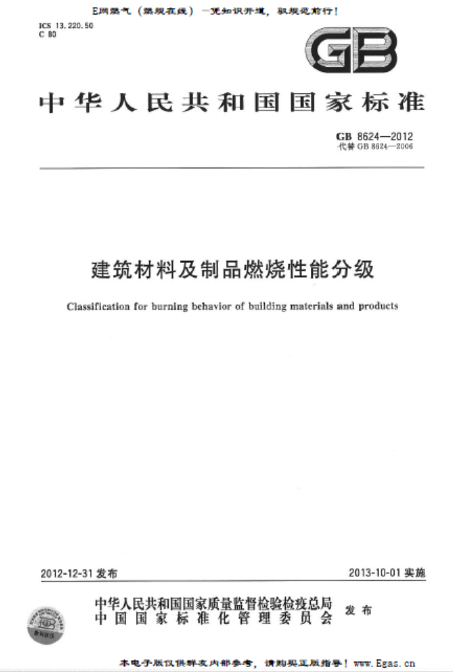 建筑材料及制品燃燒性能分級GB 8624-2012:本標(biāo)準(zhǔn)規(guī)定了建筑材料及制品的術(shù)語和定義、燃燒性能等級、燃燒性能等級判據(jù)、燃燒性能等級標(biāo)識和檢驗(yàn)報(bào)告。