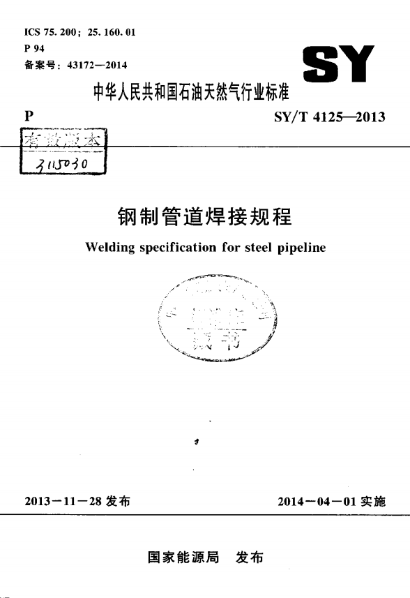 鋼制管道焊接規(guī)程 SY/T 4125-2013 :本規(guī)程適用于輸送介質為氣體、液體和漿體的長輸管道及油氣田集輸管道的安裝焊接,管道材質為碳素鋼、低合金鋼、奧氏體不銹鋼、不銹鋼復合管.焊接方法為鎢極氬弧焊、焊條電弧焊、熔化極氣體保護電弧焊(包括自保護半自動焊、氣保護半自動焊、氣保護自動焊)、埋弧焊,以及上述焊接方法相互組合的方法。