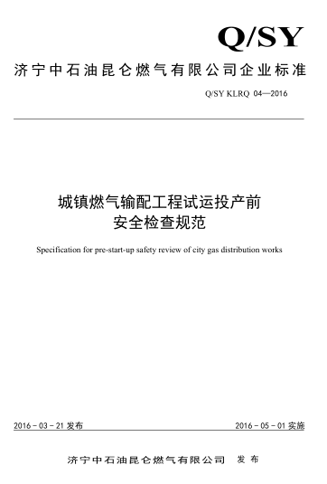 城鎮(zhèn)燃氣輸配工程試運投產(chǎn)前安全檢查規(guī)范 Q/SY KLRQ04-2016:本規(guī)范規(guī)定了濟寧中石油昆侖燃氣有限公司(以下簡稱昆侖燃氣公司)城鎮(zhèn)燃氣新、改、擴建項目試運投產(chǎn)運行前安全檢查等內(nèi)容和要求。